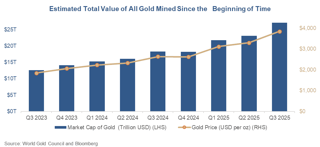 Growing geopolitical tensions, deteriorating global trade relations, swelling U.S. fiscal deficits, and rising concerns about the long-term resilience of the U.S. dollar have driven investors toward gold as a stable and liquid store of value. This surge in demand has pushed the estimated total value of all above-ground gold to more than USD 27 trillion as of September, more than double gold’s “market cap” from just two years earlier.