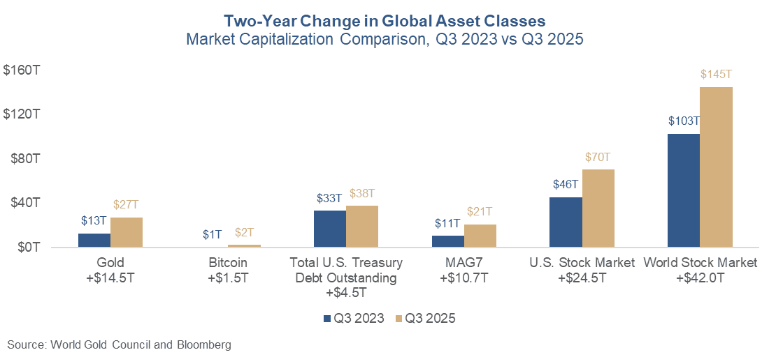 Gold has rapidly become one of the world’s fastest-growing asset classes, surpassing broad equity market performance, including that of the Magnificent 7 in recent years. The scale of above-ground gold now eclipses the total value of Bitcoin and is closing in on the size of the U.S. Treasury market, long regarded as the premier global safe-haven asset.