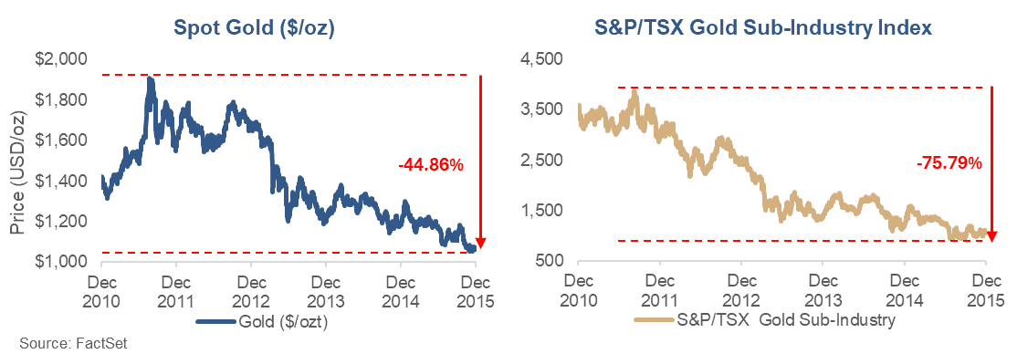 Price consolidation can be severe. From the 2011 high to the late-2015 trough, gold fell almost 45%, and precious metals equities suffered even more dramatically—the S&P/TSX Gold Sub-Index recorded a total return of -75.79%.