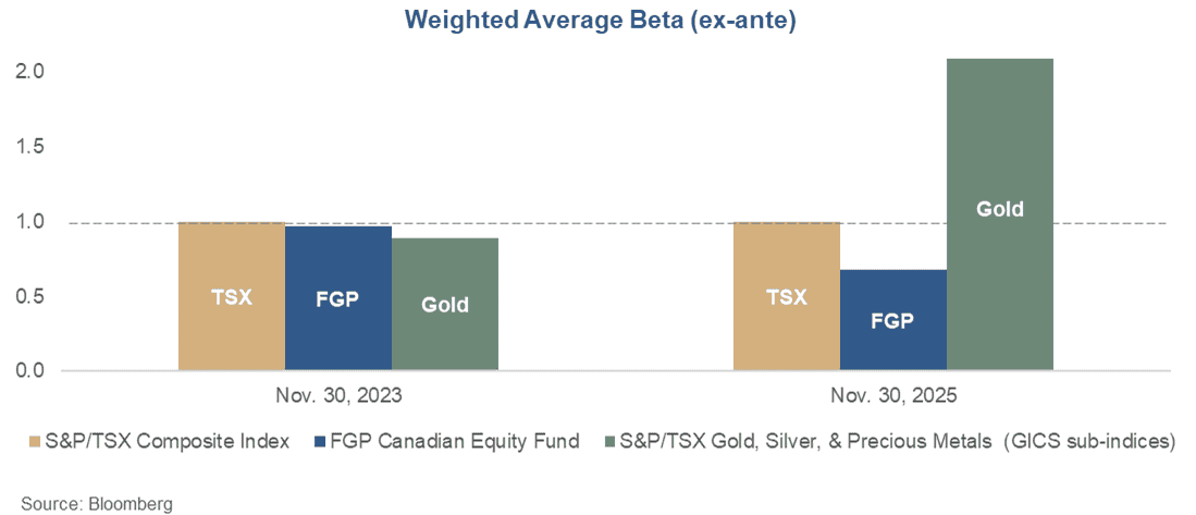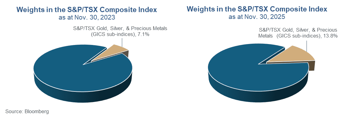 At the end of November 2025, the weighted-average beta of precious metals equities included in the S&P/TSX Composite Index, on an ex-ante basis, was 2.09, implying these companies are more than twice as volatile as the Index. This is a material departure from the past, when precious metals equities were often less volatile than the overall market.